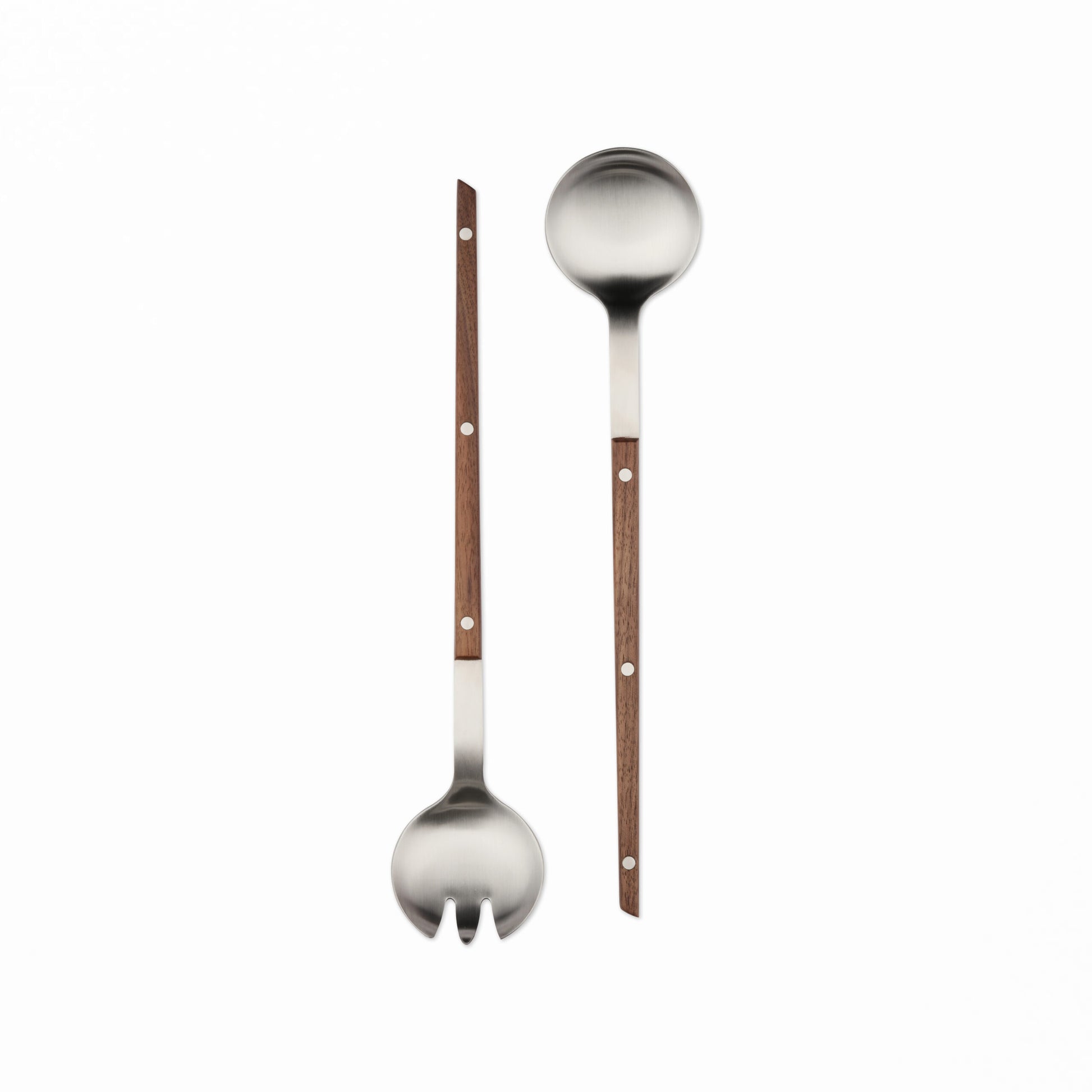 Elegant salladsbestick i rostfritt stål med valnötsträ som lyfter servering med naturlig elegans.