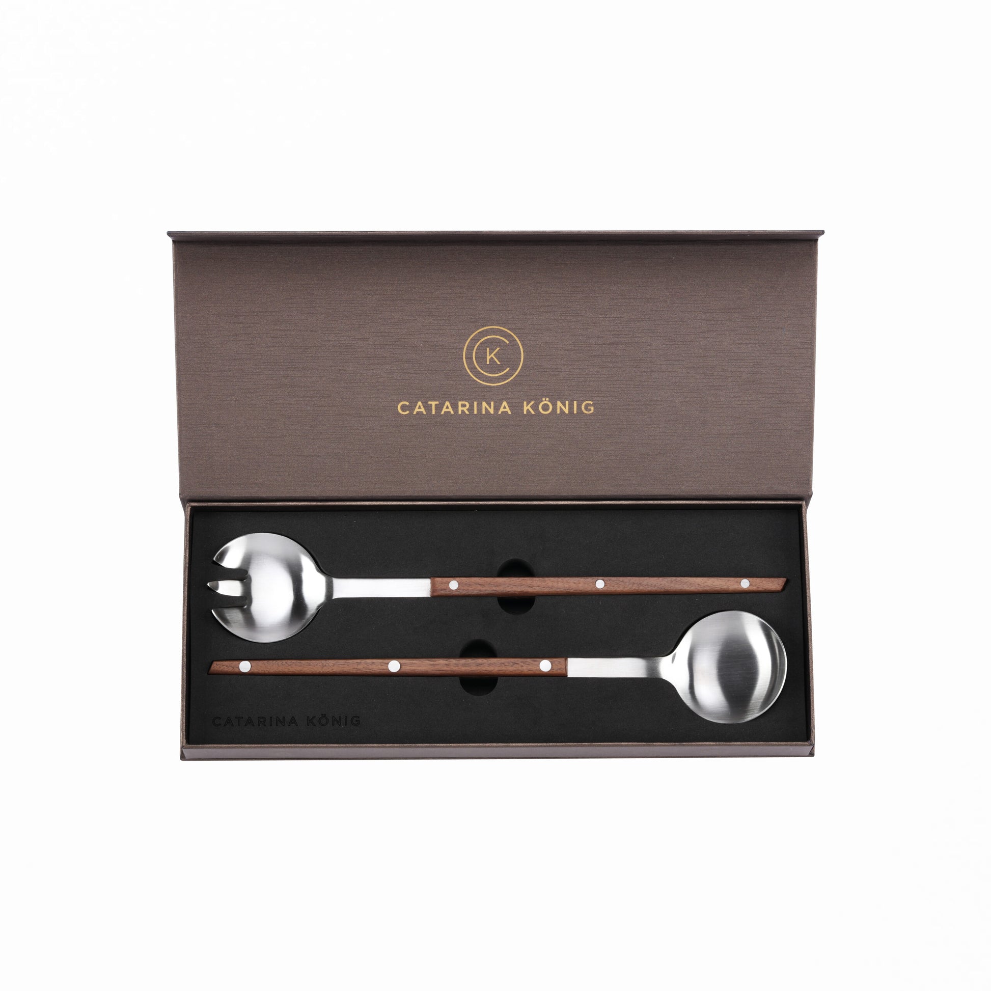 Detta eleganta salladsbestick 2-delar från Catarina König Wood Collection är ett stilrent set som passar perfekt för att servera fräscha sallader med finess. Besticken är tillverkade av högkvalitativt rostfritt stål samt har vackra handtag i valnötsträ som ger en varm, naturlig och exklusiv känsla till din dukning. Setet är perfekt för att servera sallader med stil och ger en lyxig touch till både vardag och fest. Levereras i en exklusiv presentkartong , vilket gör det till en perfekt gåva för den som älskar vacker servering.