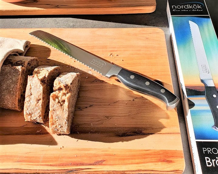 Brödkniv 21cm från Nordkök. Att ha en bra kökskniv är en av hörnstenarna inom matlagning för att kunna skiva och hacka råvaror på ett effektivt och säkert sätt. Våra knivar är framtagna i molybden vanadiumstål som håller skärpan länge och går bra att slipa vid behov.