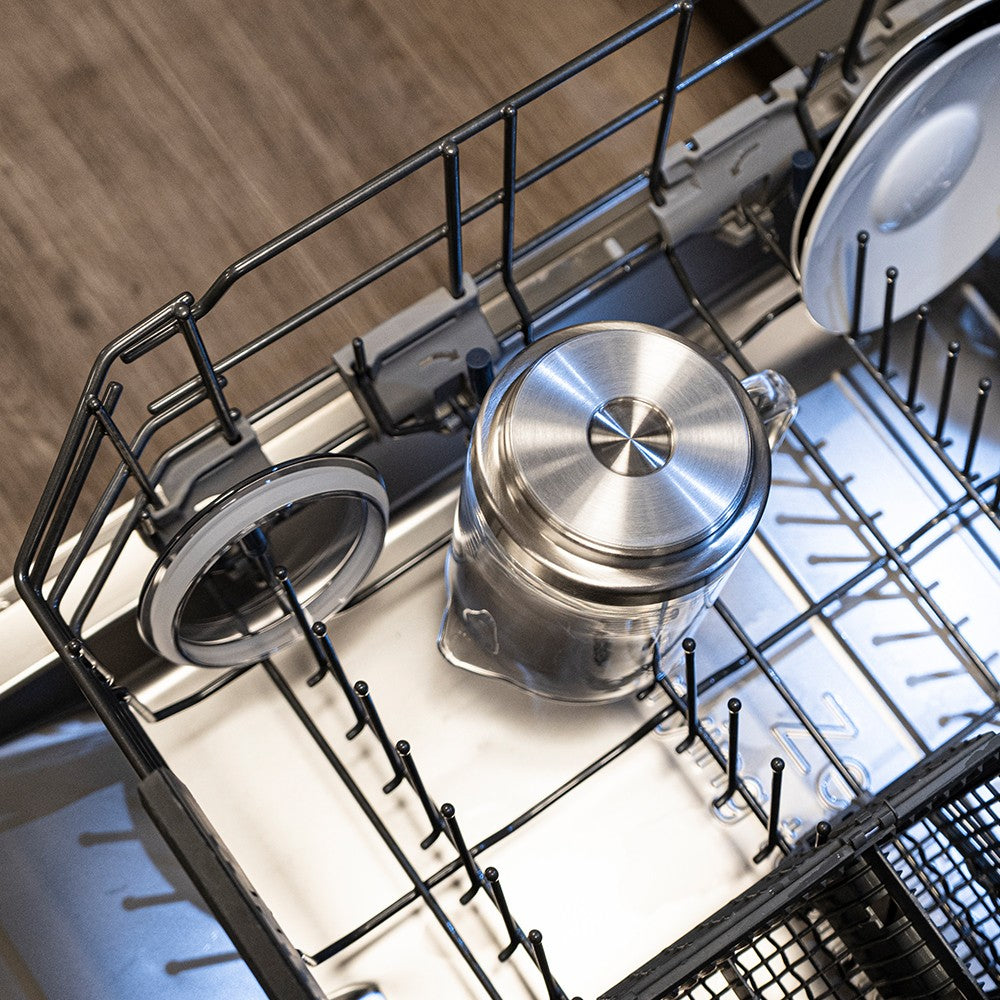 - Säkerhet under drift: kan endast startas med kannan på plats, akustisk signal i slutet av programmet, halkfria silikonfötter